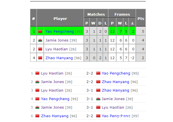 然而,最终晋级的却是本赛季刚刚赢得劳动赛参赛经验的姚一又成,他以1胜2平的战绩力压其他三名敌手赢得小组冠军,得手晋级32强。而在第15组的争夺中,名将斯蒂芬-马奎尔夺得小组冠军。