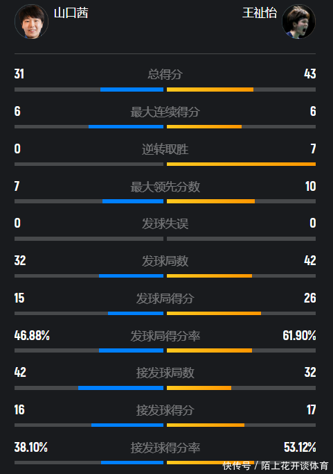 首局比赛开打之后,现场球迷一直在给王祉怡加油打气,然而她显得不够怡悦,一直在随着山口茜的节律在打,日本一姐在2平之后,打出了我方最擅长的快节律攻防大战,旁边活泼的眼下移动,给我方创造出了颠倒多劈杀的契机,径直连得5分,建造起了7-2的跨越,天然王祉怡也一直在勤奋编削我方,但山口茜照旧不断扩大跨越的优势,以11-4插足中局间歇。
