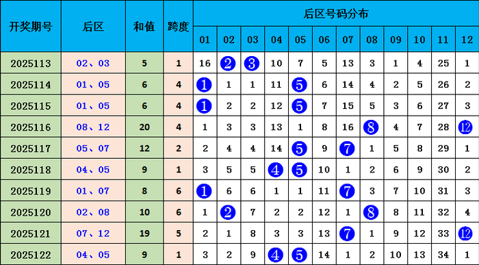 上期后区奖号04 05,为小小、偶奇组合,最近5期后区号码奇偶比为5:5,大小比为4:6,。本期后区保举小大、奇偶组合,保举03 08。